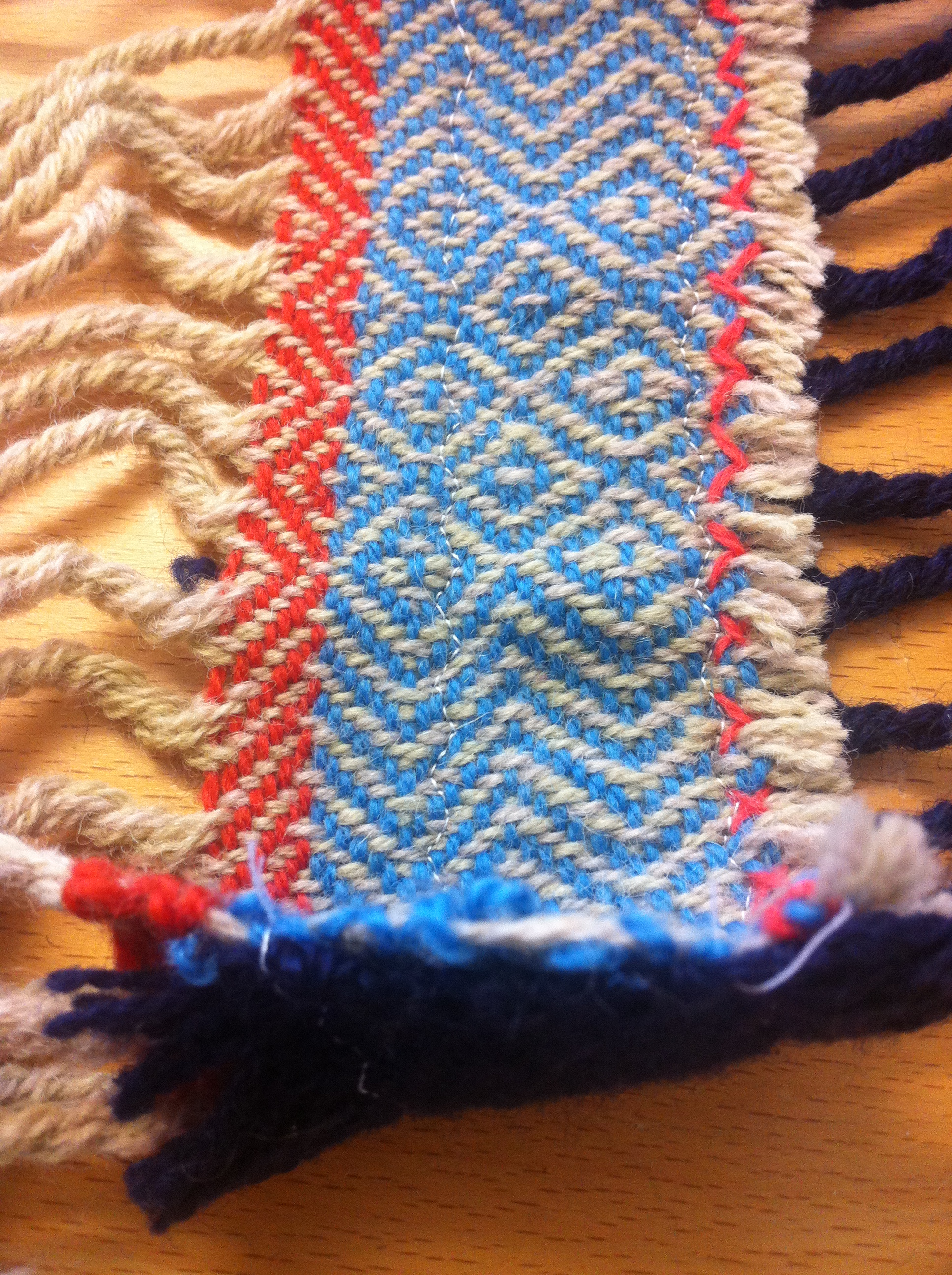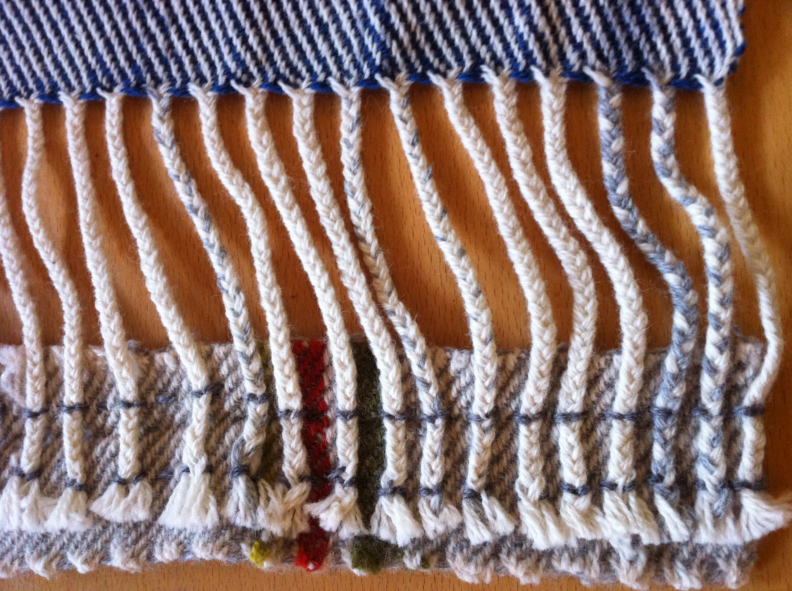 Om pläden saknar fäste så kan du göra som bilderna här nedan visar. Kom ihåg att sy fast ordentligt över fransarna, helst på maskin med sicksack/tresteg.